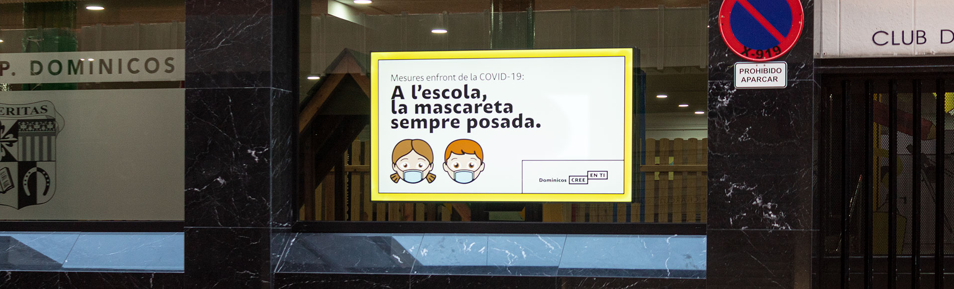 Debido a las necesidades de este proyecto instalamos una pantalla LCD de alto brillo y de gran formato en el escaparate junto al acceso al centro.